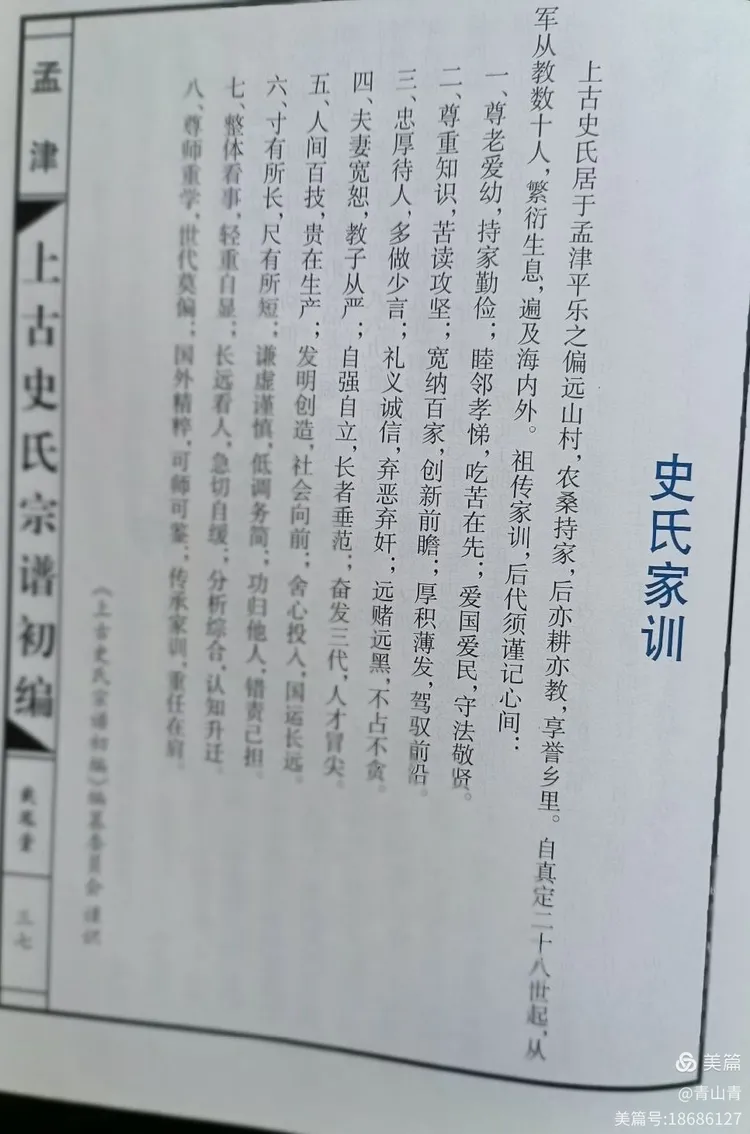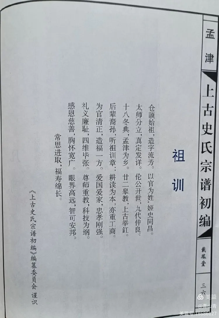 祖训三十句,前面叙述史氏发源、发展的历史及关键人物,后面是训纲。加入科拔兴国的理念,彻底切除了封建社会官本位的尾巴,告诉族人真正推动社会发展的是科学技术,科技进步才是真正意上的革命!上层建筑必须符合科技进步、经济发展的诉求,只有这样社会才能进步,人民才会幸福。违背这一主线的必定是邪教。用正道教育后代,用正道发展国家。