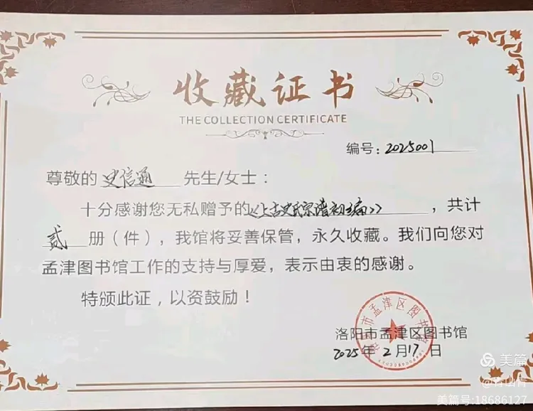 这是信通赠谱后,收藏方给的收藏证书。我们的宗谱将交由众多的海内外图书馆等单位收藏。这毕竟是华夏文化史的一部分,具有超时代的永久意义。