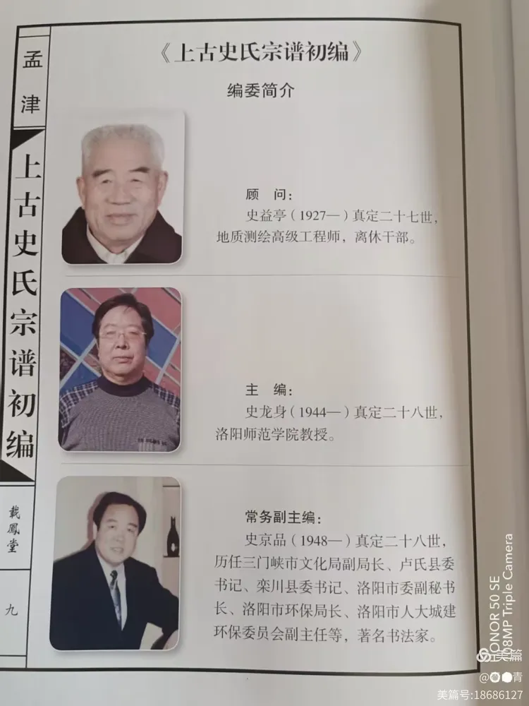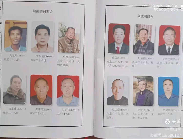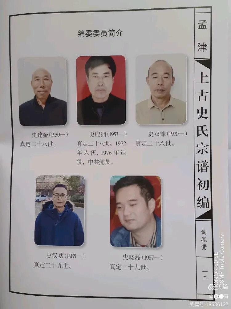 河南省洛阳市孟津区平乐镇上古村史氏属真定世家,发祥于正定,流支由九世仲良公(元代万户侯)定居于辖地偃师史家湾,后由偃师二门的17世自恭公迁至顾县镇,又由18世的冬典公𨺗居孟津县东关,再由21世载忠公的两个孩子皋(老二)和教(老四)先后𨺗居上古,繁延至今,已逾10代。东支(东古洞)耕读持家,子孙已广布四海;西支(史家坑儿、后迁至西街)农商並举,曾富甲一方。2025年2月11日家谱初编印讫,12日(正月十五)在东支故居举行了隆重的祭祖暨宗谱颁发典礼,鞭炮声震四野,人声鼎沸,焚香烧金银,祭酒,行三跪九拜大礼,颂祭祖文,村支书代表村委会致贺词,京品致感言……