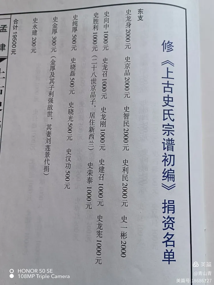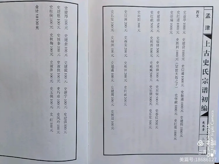 这是东支捐资名单,下边一个是西支损资名单。2024牟12月11日晚上8点半举行了《上古史氏宗谱》编委会第四次视频会议。会上西街代表史信通汇报了捐资一万八千一百元的情况。他说,“这次编写家谱捐款,西街任务是12500元,实际完成18000余元。特别要感谢我的好哥哥,咱们这次捐款小组长史建设,他带头组织家庭捐款3000元,当天晚上又给我打款2000元,说是备用金。(其实是怕我作难)他这种体贴关爱的兄弟情,值得发扬光大,我会永远铭记!”东支代表史龙昭汇报了捐资一万九千五百元的情况,表扬了史一彬、史胜利、史荣泰、史金厚家人等,指出史家不惹事、不怕事、团结奋进的家族品质和作风是一贯的。