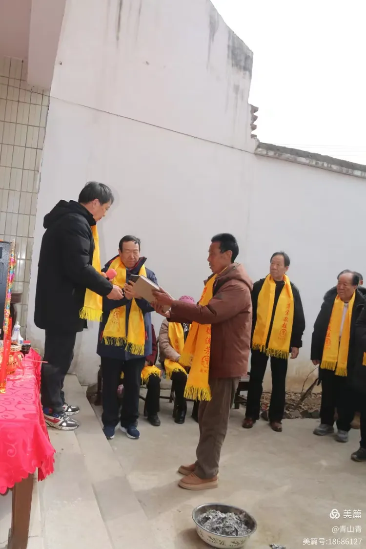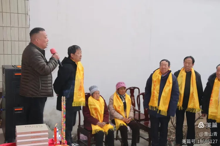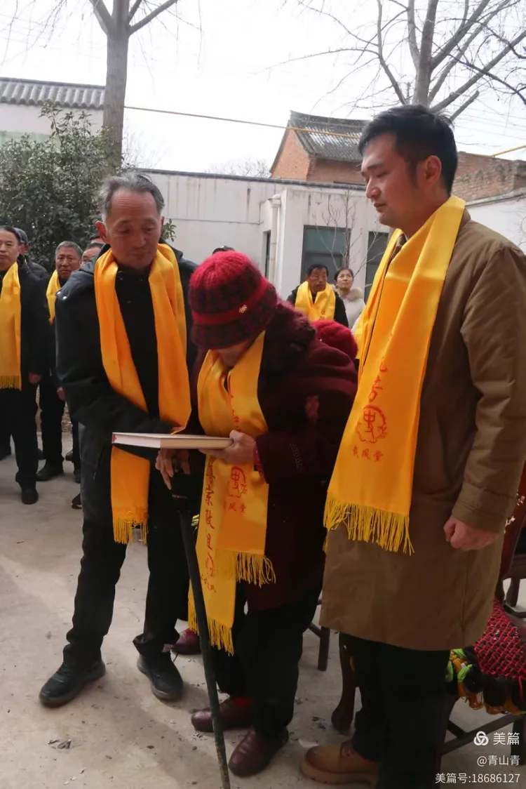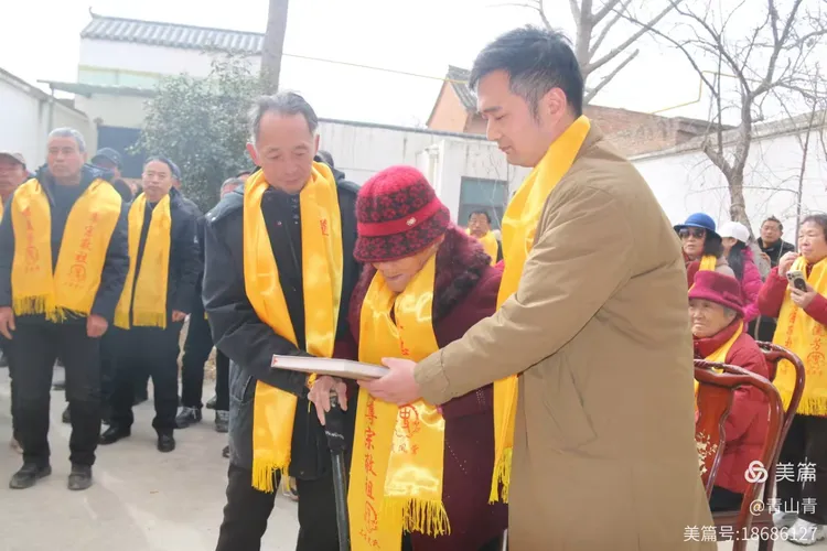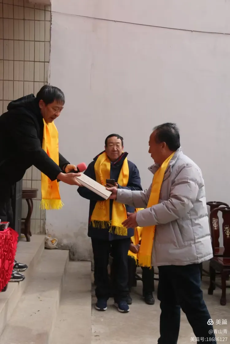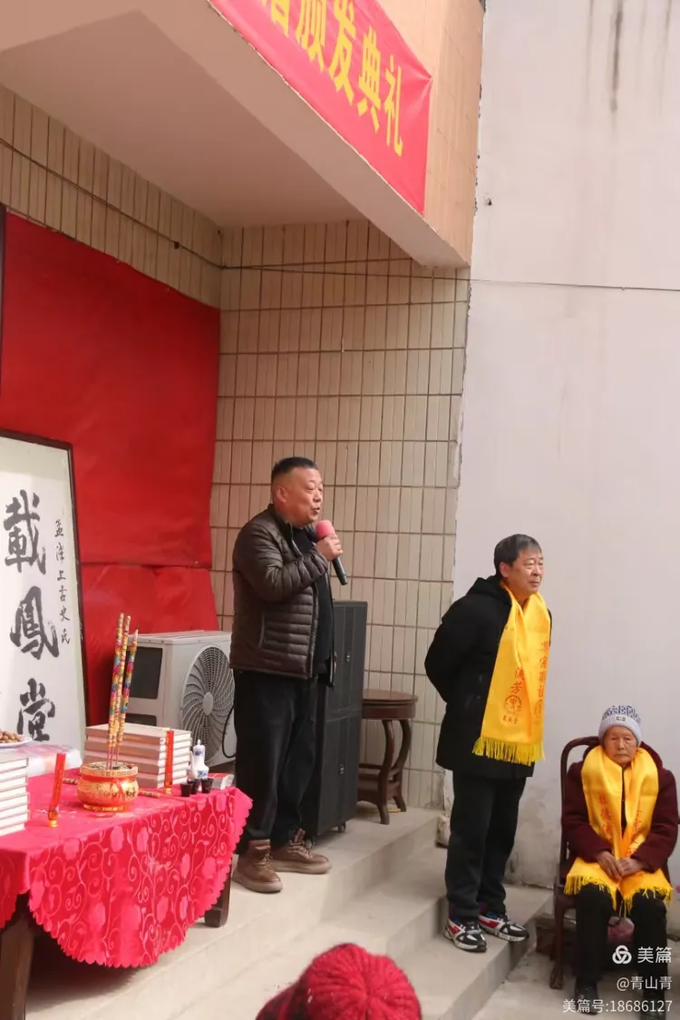 然后是给寿星方桂珍赠谱。老人12岁嫁到史家,一生辛苦劳作,是队里的生产能手。凭一己之力,把两儿一女三个孩子拉扯大。如今90多岁,身体依然健康!
